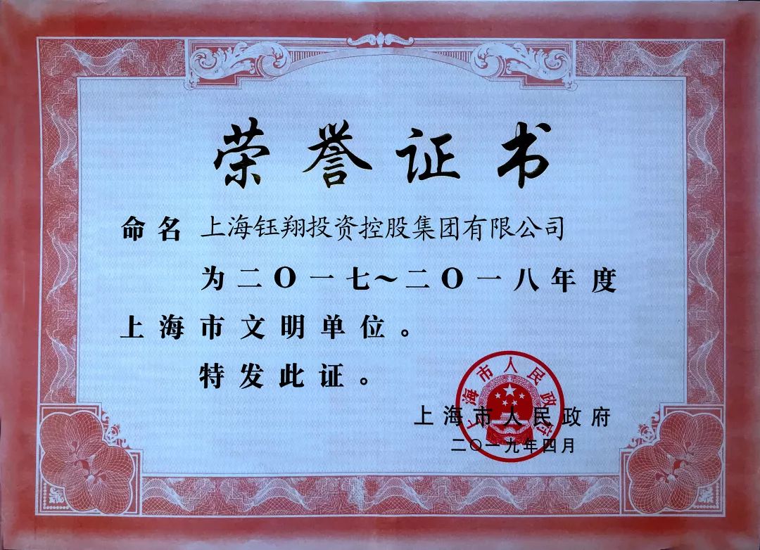 鈺翔控股集團榮獲第十九屆上海市“文明單位”稱號