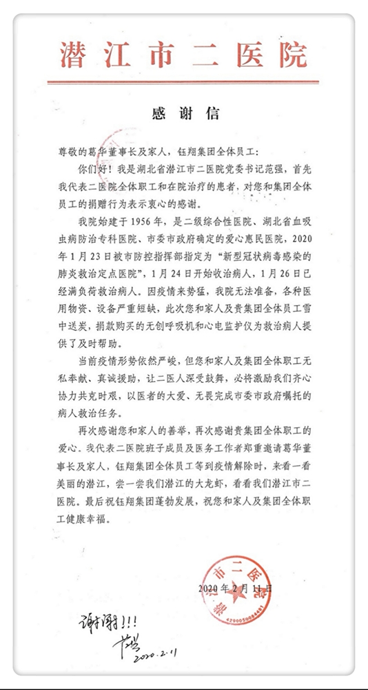 我院始建于1956年,是二級綜合性醫(yī)院,湖北省血吸蟲病防治專科醫(yī)院,市委、市政府確定的愛心惠民醫(yī)院。2020年1月23日被市防控指揮部指定為新型冠狀病毒感染的肺炎救治定點醫(yī)院,1月24日開始收治病人,1月26日已經(jīng)滿負荷救治病人。因疫情來勢兇猛,我院無法準備,各種醫(yī)用物資、設備嚴重短缺,此次您和家人及貴集團全體員工雪中送炭捐款購買的無創(chuàng)呼吸機和心電監(jiān)護儀,為救治病人提供了及時幫助。當前疫情形勢依然嚴峻,但您和家人、集團員工無私奉獻、真誠援助,讓二醫(yī)人深受鼓舞,必將激勵著我們齊心協(xié)力共克時艱,以醫(yī)者大愛、無畏,完成市委、市政府布置的病人救治任務。再次感謝您及家人的善舉,再次感謝貴集團全體職工的愛心。我代表二醫(yī)院班子成員及醫(yī)務工作者鄭重邀請葛華董事長與家人、鈺翔集團全體員工等到疫情結(jié)束時來看一看美麗的潛江,嘗一嘗我們潛江的小龍蝦,看一看我們潛江市二醫(yī)院。